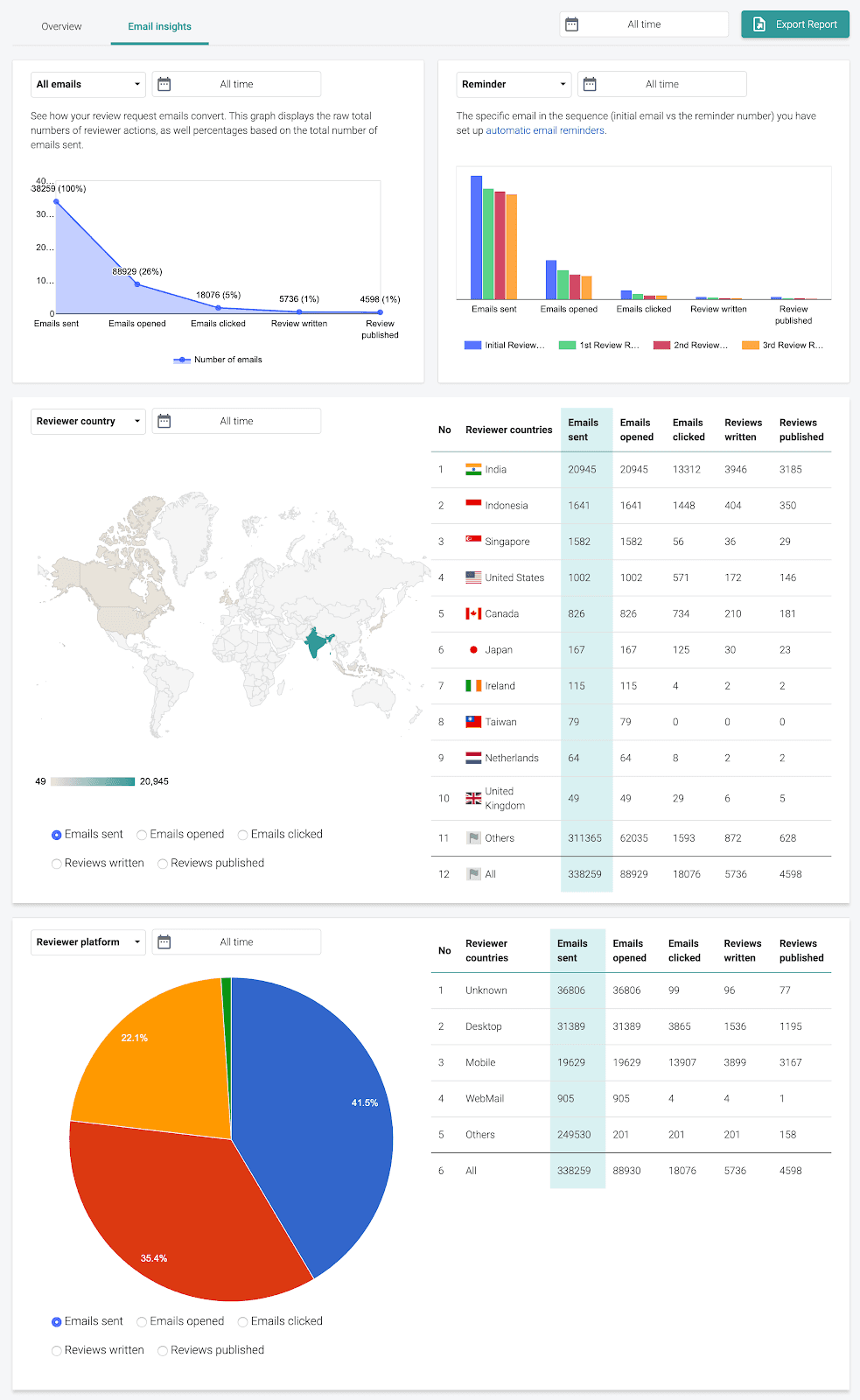 How your review request emails are performing across countries, platforms, OS, and browsers