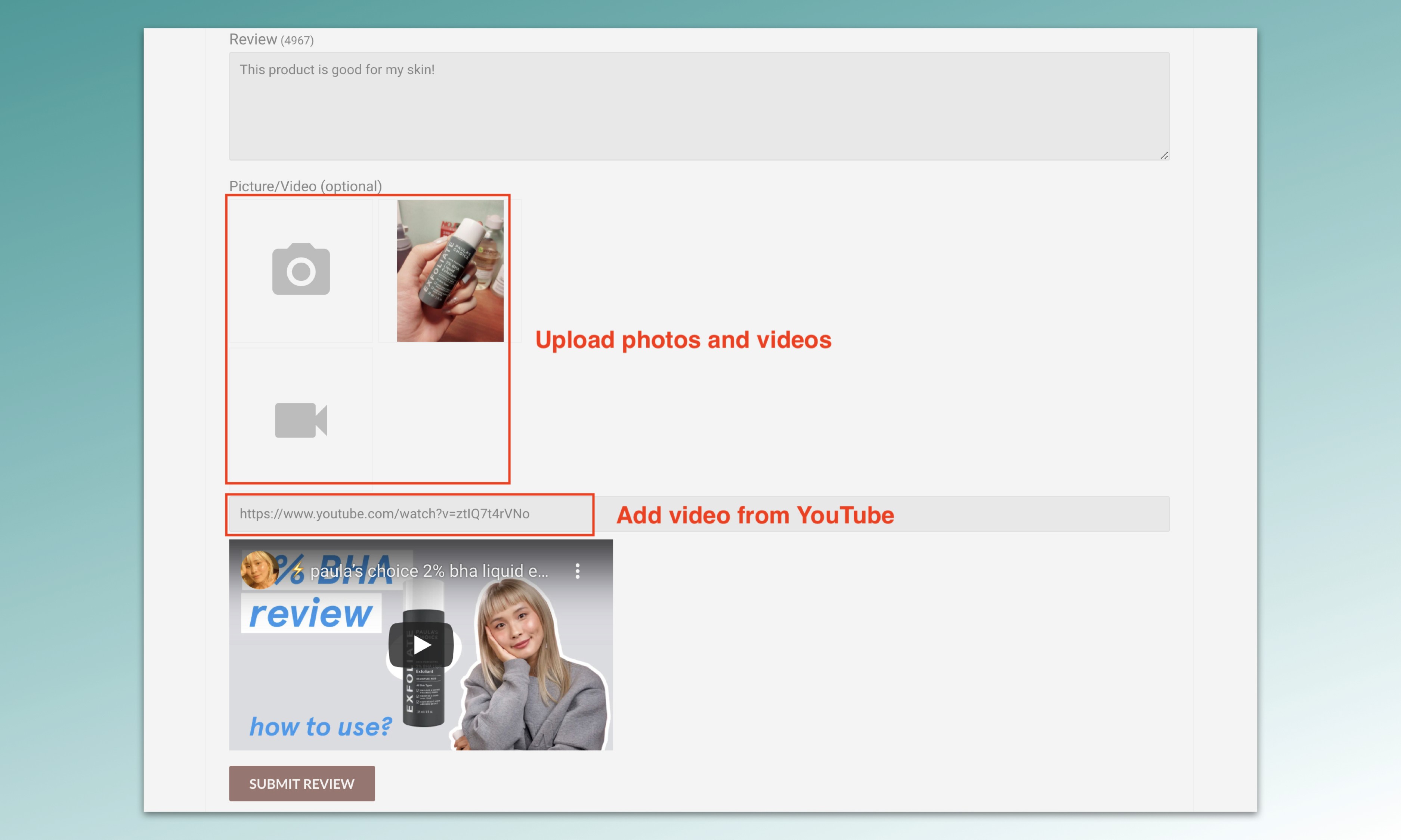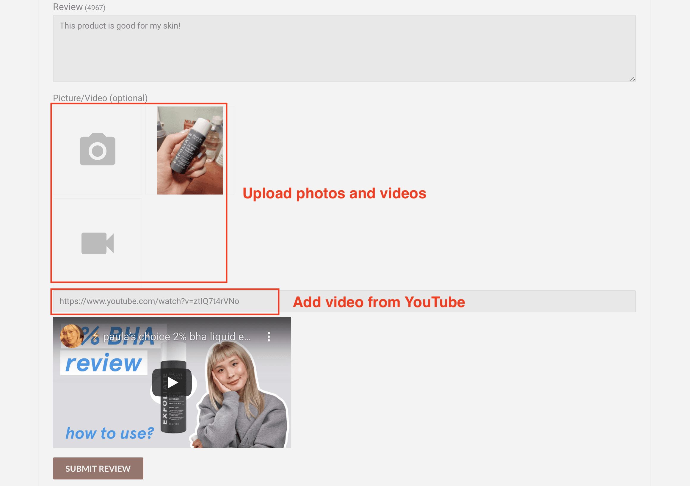 If your reviewers submit their reviews from the storefront widgets (Review Widget, All Reviews Page, and Floating Reviews Tab), they can see the video uploading section right above the "Submit" button. They just need to input the YouTube link, then the video will be displayed along with the reviews.