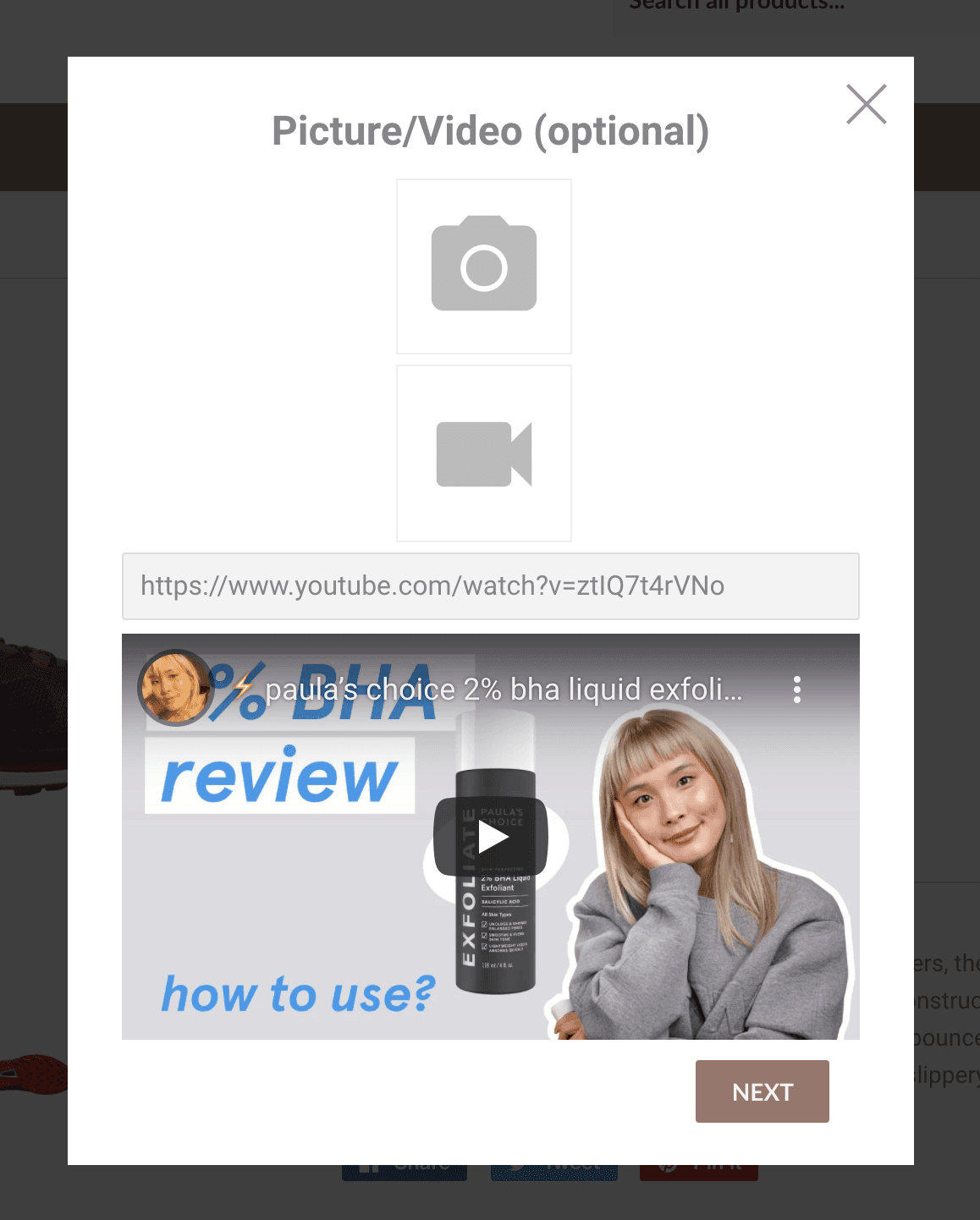 If you collect reviews from an email using a picture-first email template, or a Star block in the custom email template, your reviewers will see a pop-up form asking for photos and videos prior to the review stars and text content.