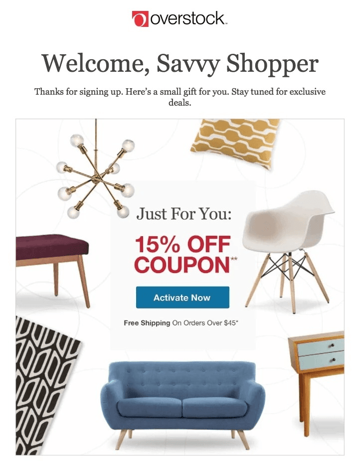 Take a look at the example email from Overstock above: Subscribers can immediately receive a 15% off coupon for signing up, making their next purchase already much more exciting. But, of course, you can get more creative and send more than just a discount code.